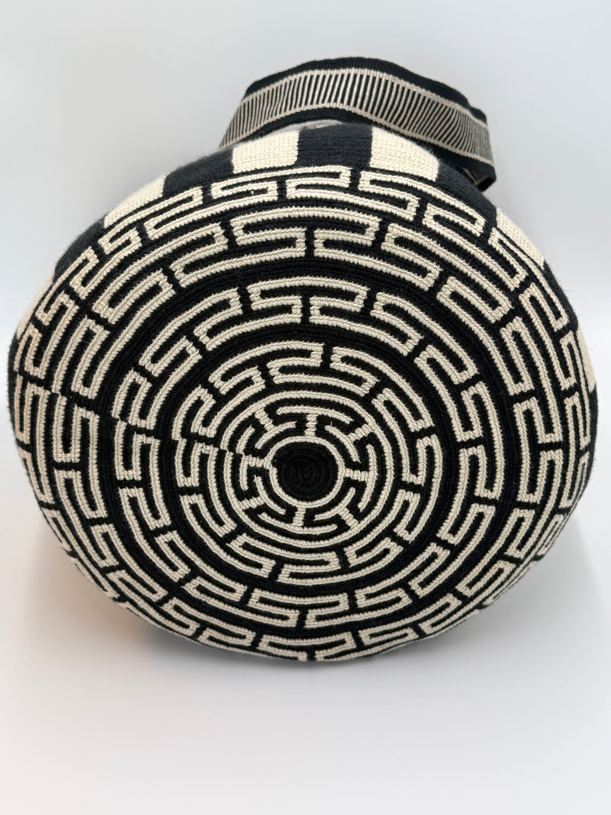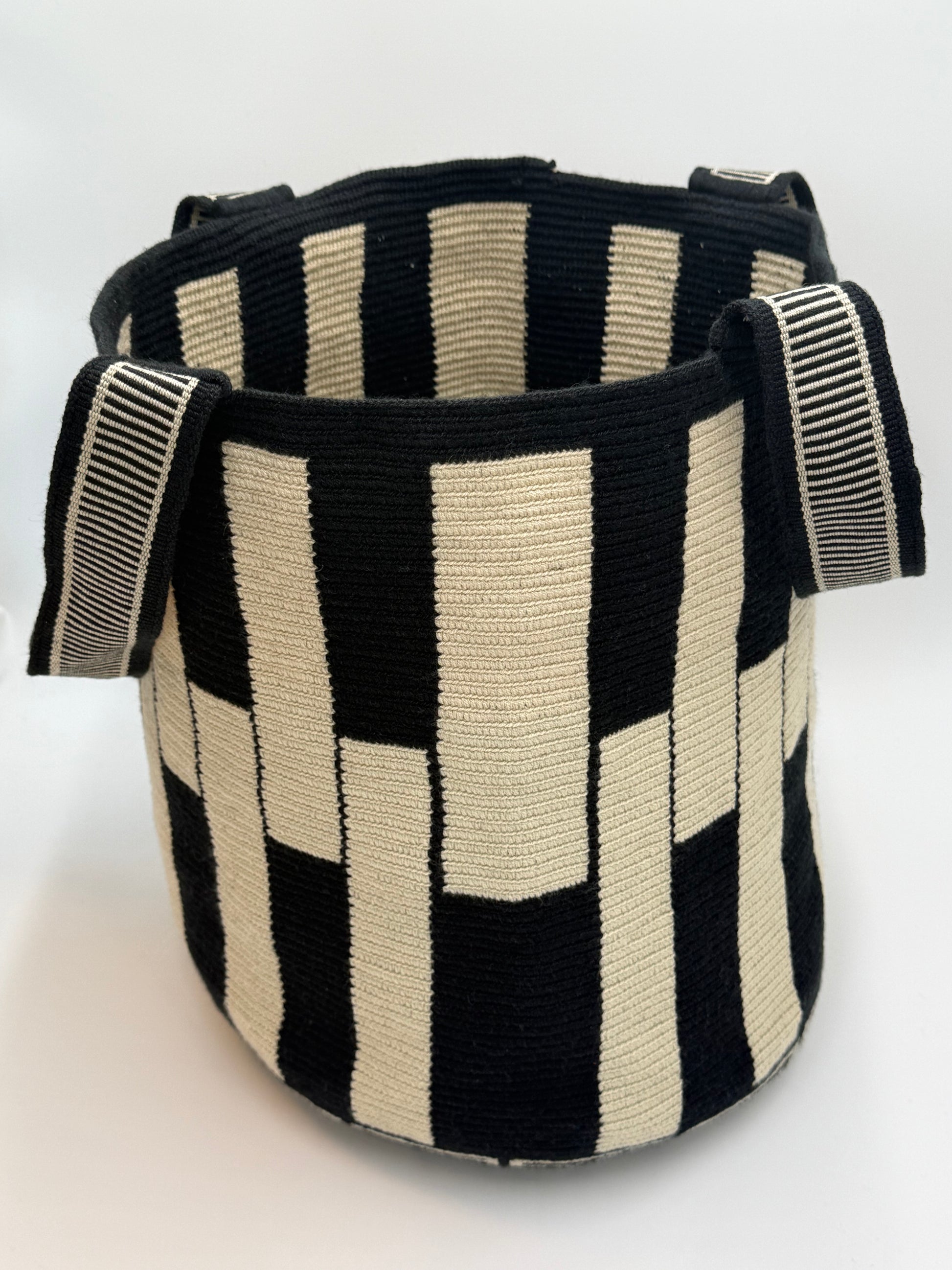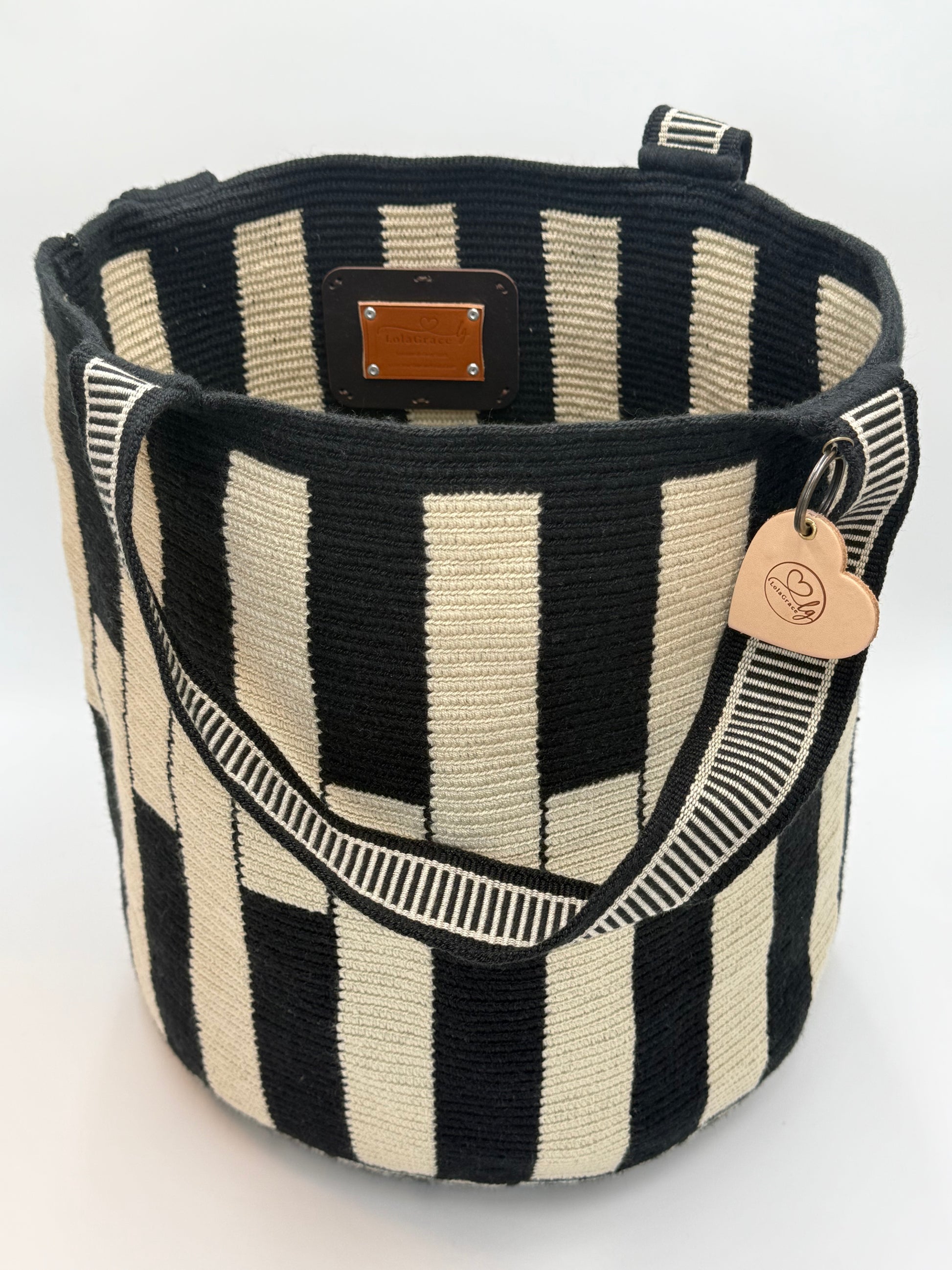 Deze LolaGrace Wayuu-strandtas is gemaakt met de dubbele draadtechniek.